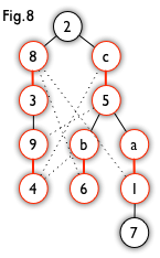 匈牙利树一般由 BFS 构造(类似于 BFS 树)。从一个未匹配点出发运行 BFS(唯一的限制是,必须走交替路),直到不能再扩展为止。例如,由图 7,可以得到如图 8 的一棵 BFS 树: