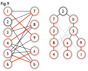 这棵树存在一个叶子节点为非匹配点(7 号),但是匈牙利树要求所有叶子节点均为匹配点,因此这不是一棵匈牙利树。如果原图中根本不含 7 号节点,那么从 2 号节点出发就会得到一棵匈牙利树。这种情况如图 9 所示(顺便说一句,图 8 中根节点 2 到非匹配叶子节点 7 显然是一条增广路,沿这条增广路扩充后将得到一个完美匹配)。