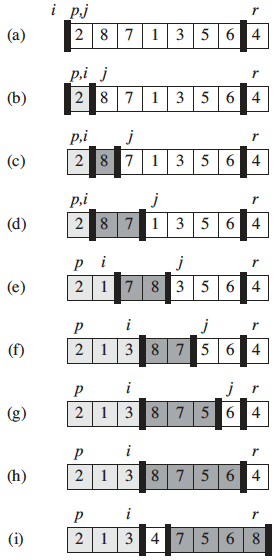The following figure shows the operation of LOMUTO-PARTITION on a sample array. Array entry A[r] becomes the pivot element x. Lightly shaded array elements are all in the first partition with values no greater than x. Heavily shaded elements are in the second partition with values greater than x. The unshaded elements have not yet been put in one of the first two partitions, and the final white element is the pivot x.