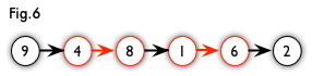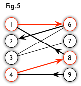 增广路:从一个未匹配点出发,走交替路,如果途径另一个未匹配点(出发的点不算),则这条交替路称为增广路(agumenting path)。例如,图 5 中的一条增广路如图 6 所示(图中的匹配点均用红色标出):