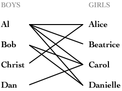 举例来说:如下图所示,如果在某一对男孩和女孩之间存在相连的边,就意味着他们彼此喜欢。是否可能让所有男孩和女孩两两配对,使得每对儿都互相喜欢呢?图论中,这就是完美匹配问题。如果换一个说法:最多有多少互相喜欢的男孩/女孩可以配对儿?这就是最大匹配问题。